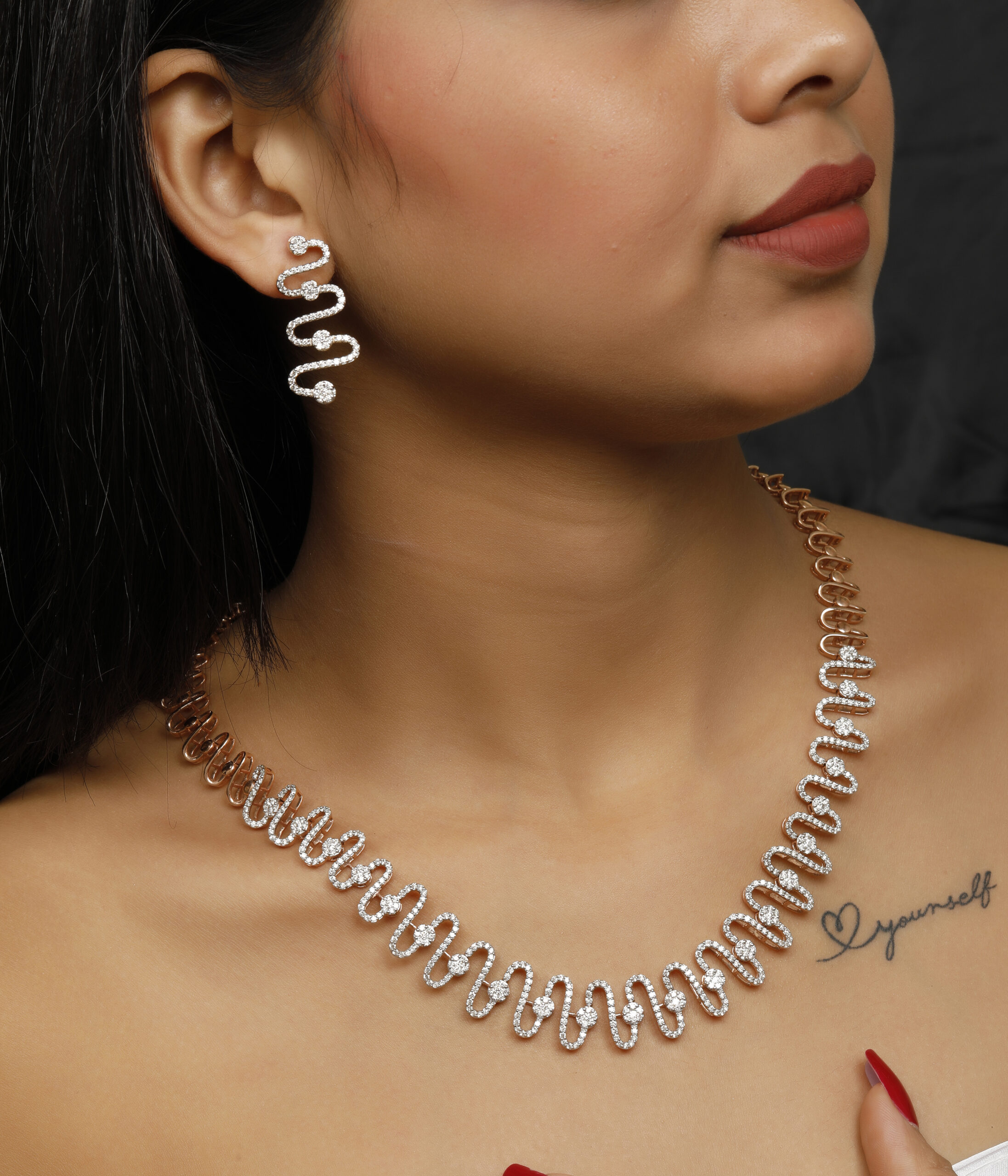 Name : The Midwave Point Necklace 14K Hallmark and 18k (both available) Gross Weight – 52.6 gram Diamond Weight – 7.87 ct Diamonds Color – H/I Diamonds Clarity – VS/SI Size – Free Size