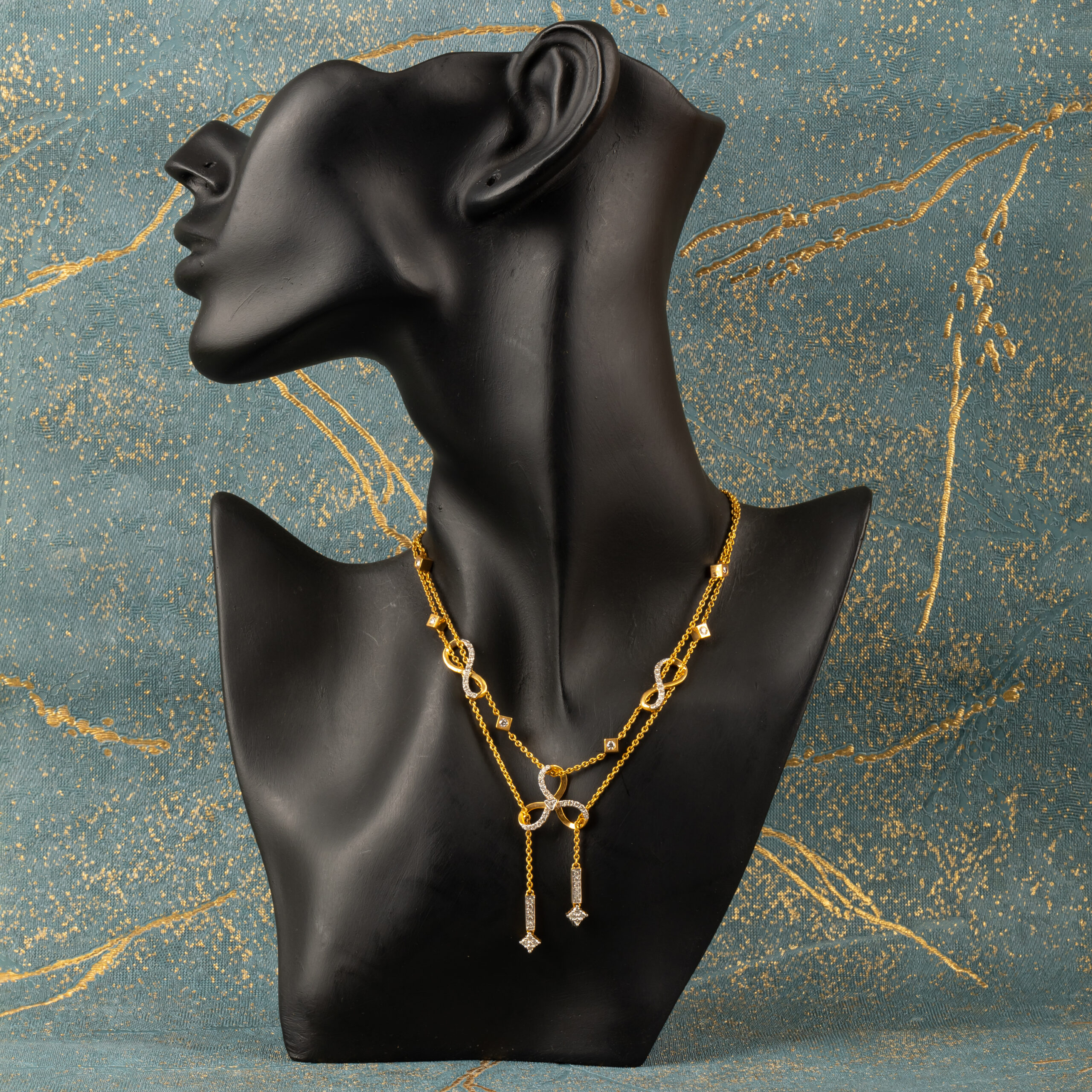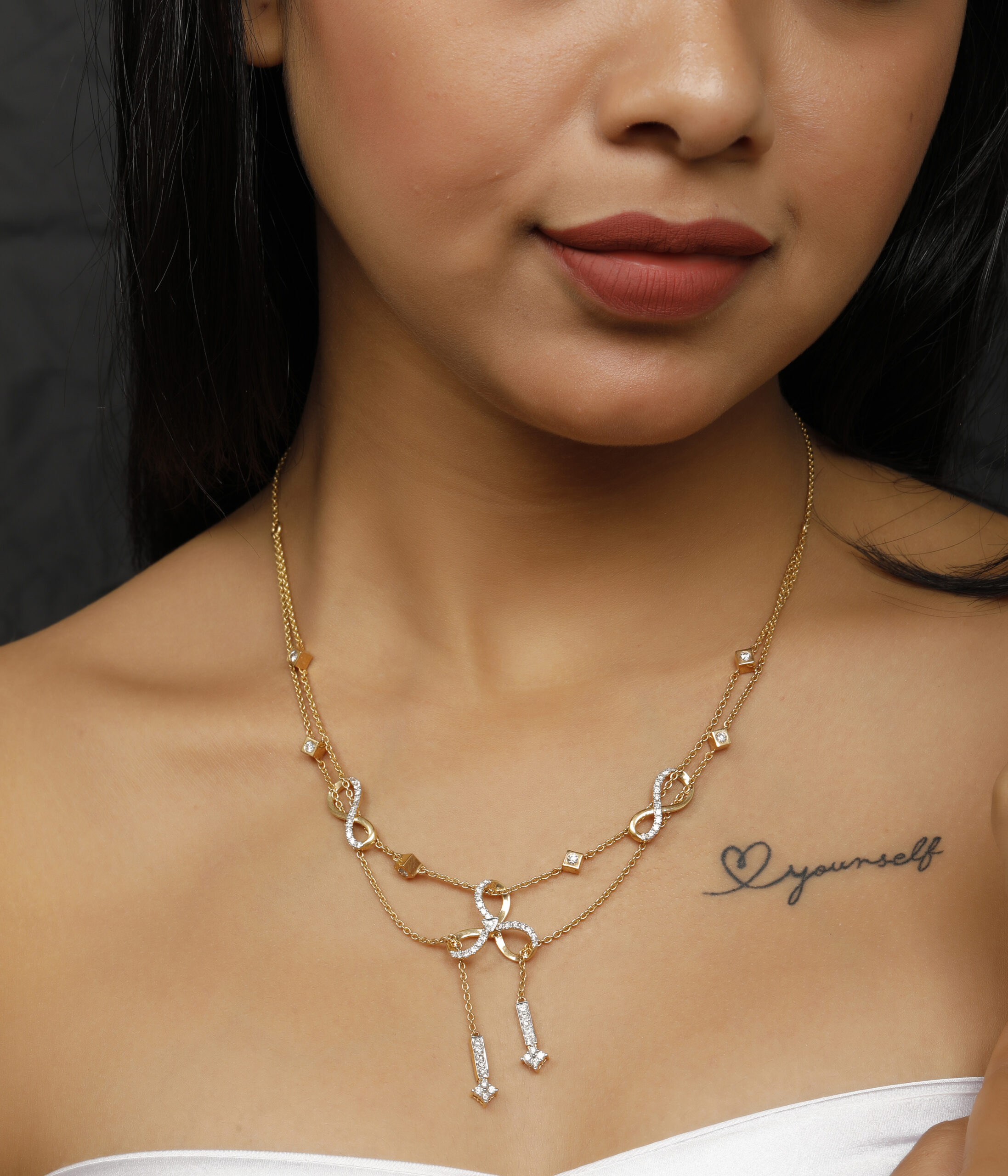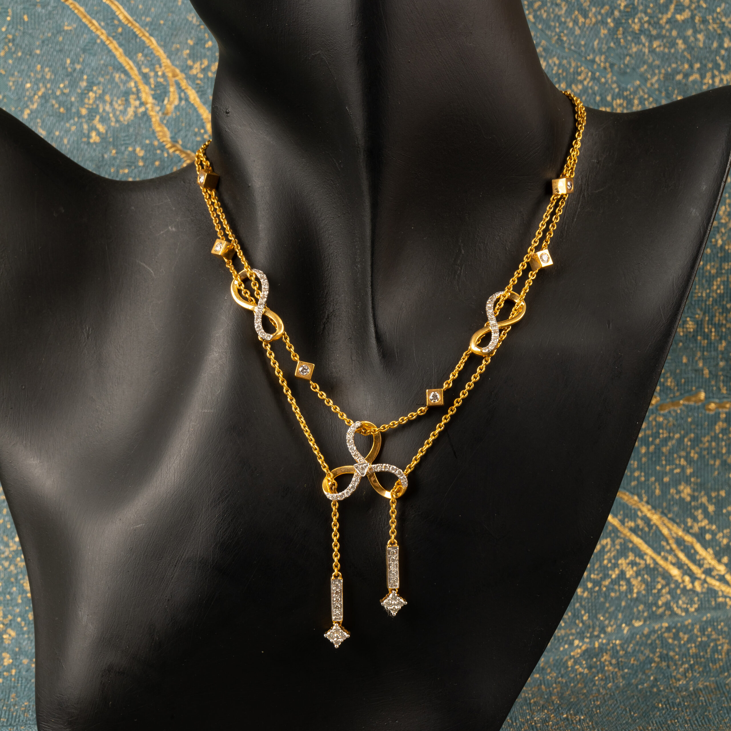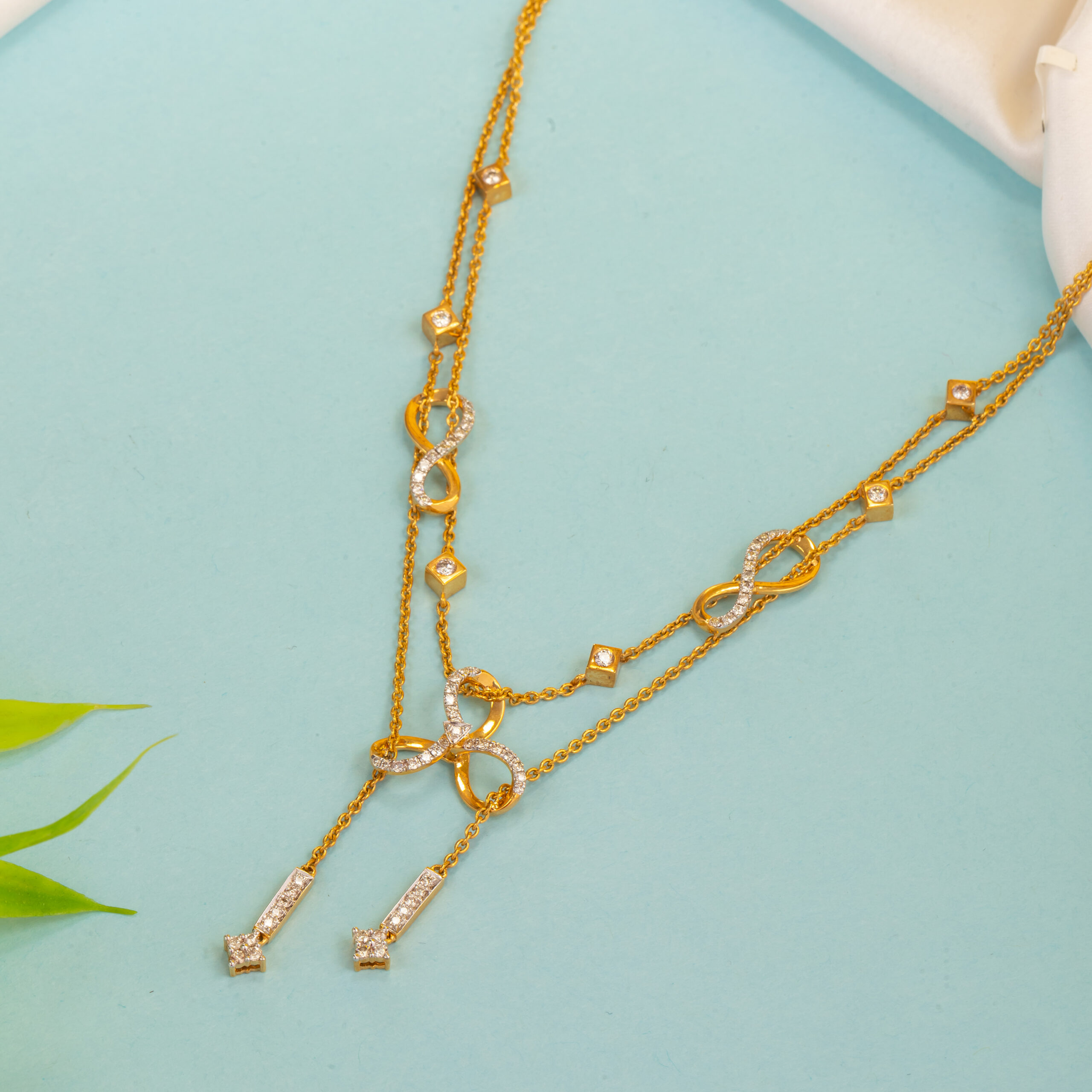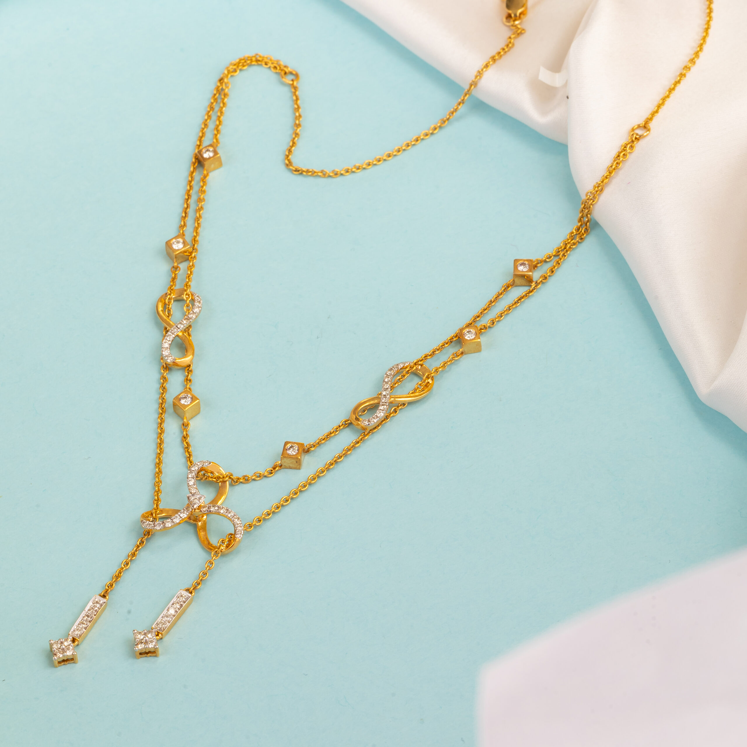 Name : Tri Infinite Necklace 14K Hallmark 18k (both available) Gross Weight – 16.080 gms Diamond Weight – 1.23 ct Diamonds Color – H/I Diamonds Clarity – VS/SI